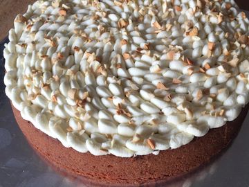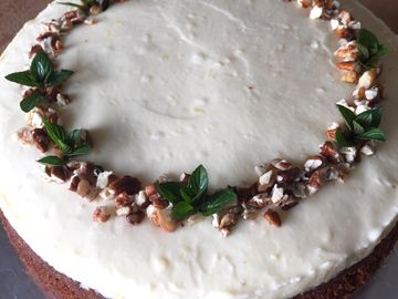 Moist carrot cake under a cream cheese topping with lemon zest and pecan nuts.