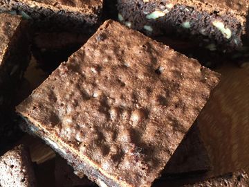 Brownie base with layers of chocolate mousses - white, milk and dark. Belgian chocolate.
