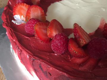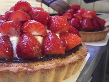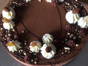 Large enough for 4 -6 people. Frangipane base with chocolate, cream and strawberries.