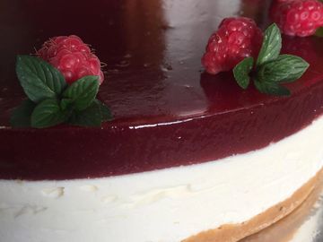 Cheese cake on a biscuit base with Raspberry Jelly.