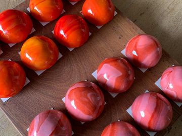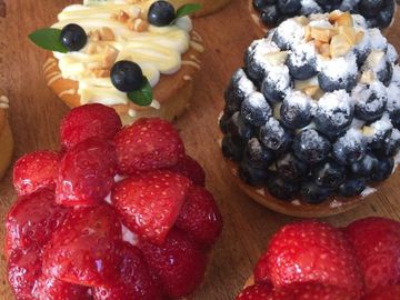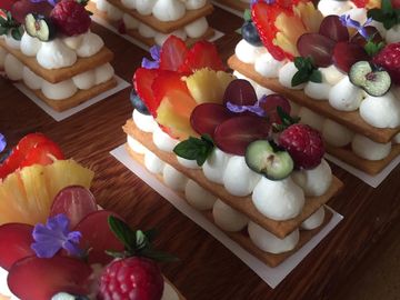 Raspberry mousse, Raspberry Jelly, light pastry cream on almond bases topped with fresh fruit of the season.