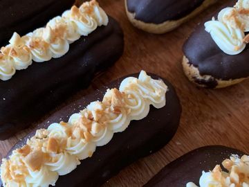 Dipped in chocolate and filled with light pastry cream