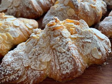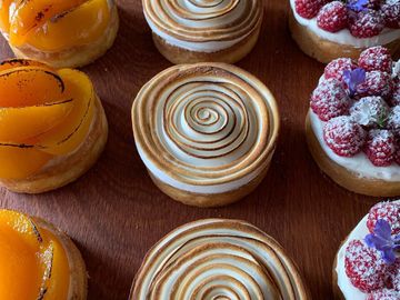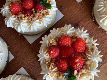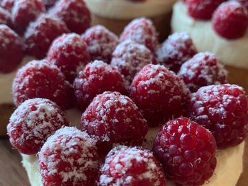 Fresh raspberries on a frangipane base with white chocolate ganache.