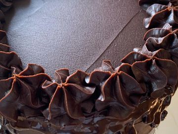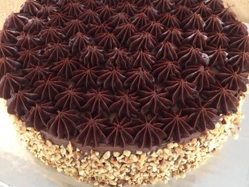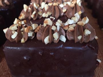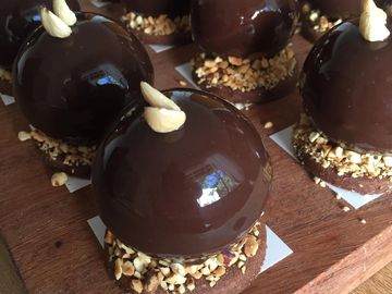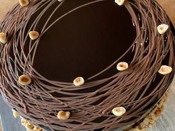 Layers of double chocolate mousse, Hazel nut mousse, Vanilla bavarian cream, Chocolate ganache, Hazelnut sponge, Chocolate brownie and coated in a chocolate Mirror glaze.
