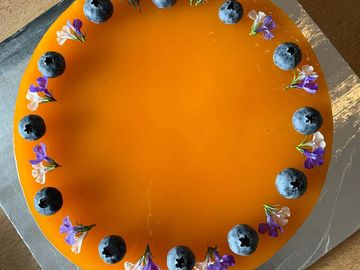 Cheese cake on a biscuit base with Passion fruit jelly.