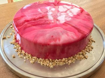 Raspberry Mousse Cake with an almond base and covered with Mirror Glaze.